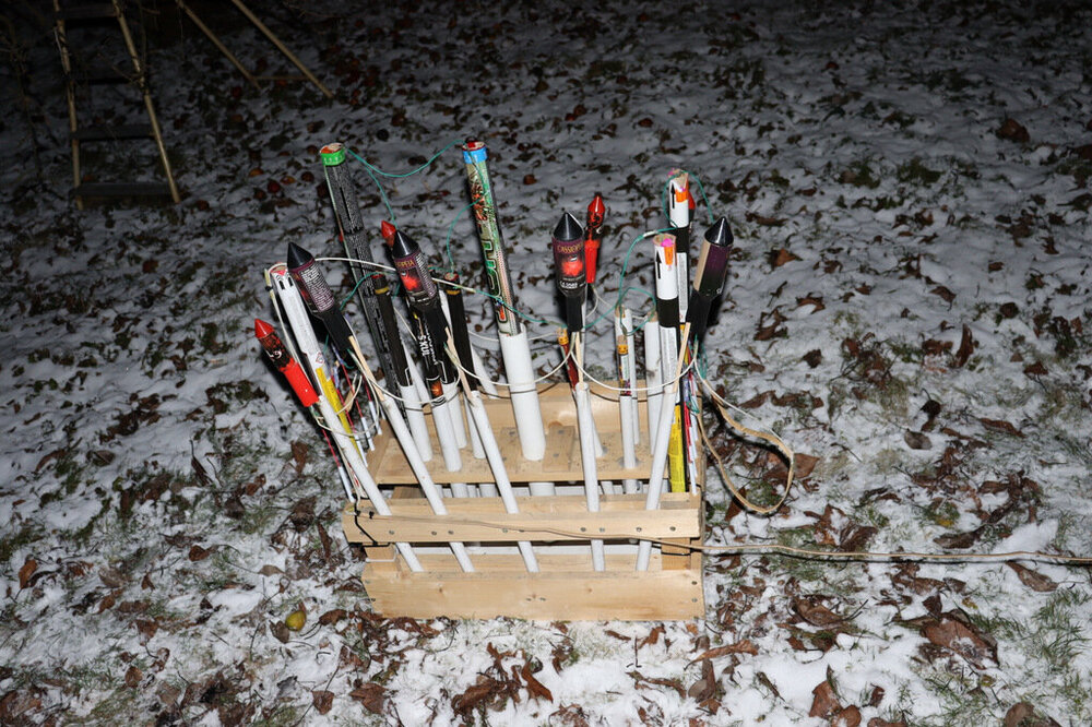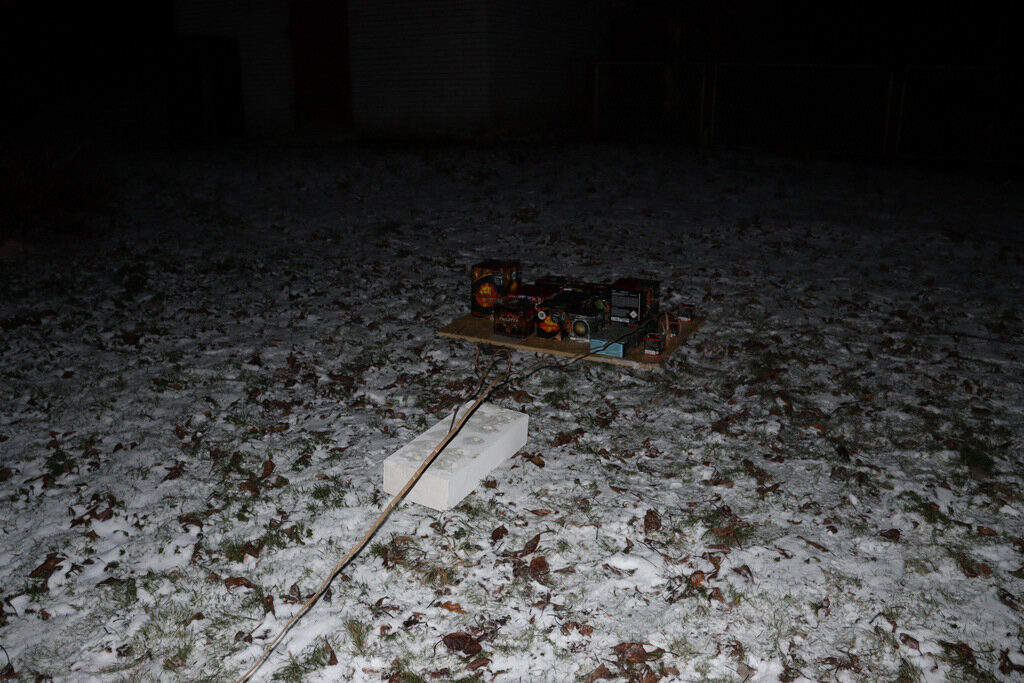 Witam w Nowym 2026 Roku Jako że przez okres świąt jak i po świętach brakowało czasu na internet i aktywną działalność na naszym forum jeszcze w tym poście powrócę do poprzedniego roku i przedstawię zmontowany stuff jaki pomyślnie został odpalony w ostatniego Sylwestra. Zestaw po 23 z pomocą żony został zaniesiony do ogrodu, gdzie po toaście noworocznym został odpalony. Wszystko zostało odpalone z jednego lonta. Pierwsza została odpalona skrzynia z zestawem rakiet oraz rzymskich ogni, a ogień został przekazany lontem superszybkim na oddaloną o 5 metrów płytę OSB z zestawem połączonych ze sobą kostek. Lont szybki został w połowie długości zabezpieczony przed kontaktem ze śniegiem żeby nie zawilgł. SZCZĘŚLIWEGO NOWEGO ROKU