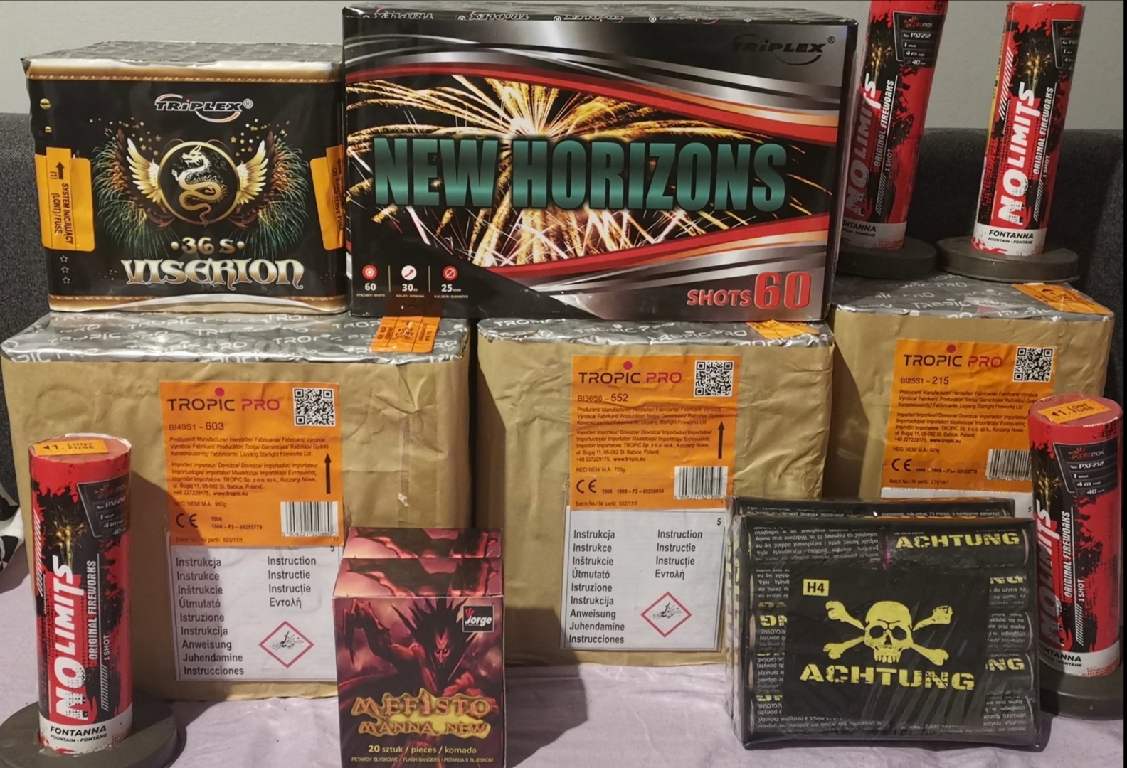 Żeby nie było ? Cóż tu mamy.... 4 fontanny no limits, nie trzeba przedstawiać. Signalosow tu nie ma, więc petard nie ma co przedstawiać. Konkrety - BI49S1-603, BI36S6-552, BI25S1-215 moje pierwsze pro, liczę, że będę ukontentowany :) Dodatkowo zachwalany Viserion i całkiem, całkiem wyglądający 60 strzalowiec New Horizons. Koniec? ?