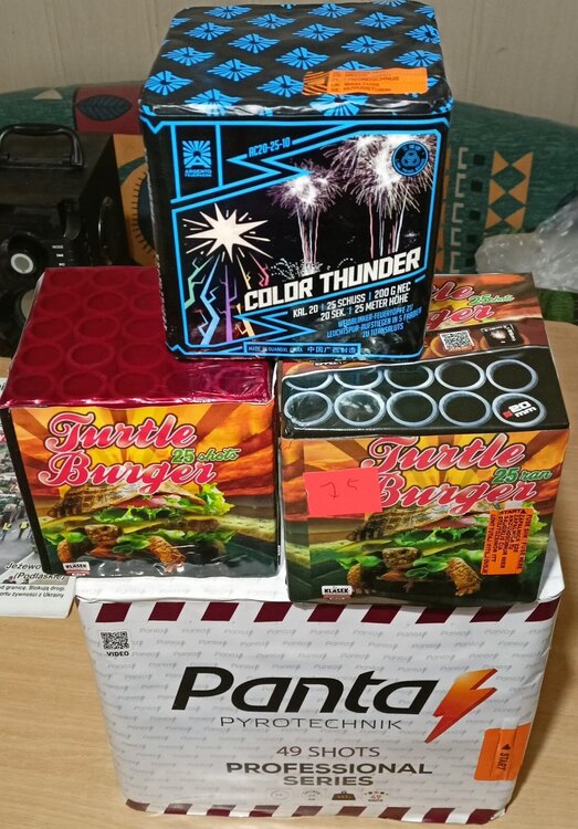 Koopacz 63 Autor Opublikowano 6 Marca 2024 (edytowane) Witam Tym razem zakupy prawie typowo hukowe, czyli odpalane będą w sylwestra około godziny 21. Jako pożegnanie starego roku. Pantę widziałem dwukrotnie - w dzień i w nocy na pierwszym zlocie w Słubicach ( 75 km od mojego miejsca zamieszkania). Daje czadu w nocy- co widać i czuć ( nie tylko słychać).Color Thunder mam nadzieję - zrobi swoje jak na 20 mm. Turtle burger ( z lewej partia z 2022,z prawej 2023)- cóż - mam do niej sentyment z racji okładki ( jak kiedyś już pisałem). Pozdrawiam Edytowane 6 Marca 2024 przez Koopacz Cytuj